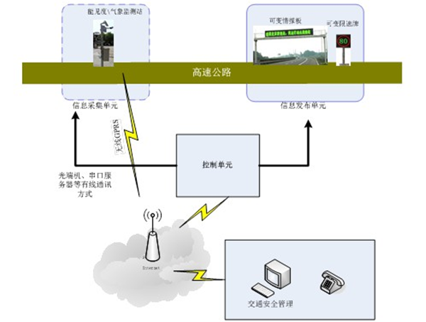 可依托高速公路上已安裝的可變限速標(biāo)志,根據(jù)不同路段檢測(cè)的能見距離,實(shí)時(shí)控制各限速標(biāo)志的限速值,這樣系統(tǒng)不但可及時(shí)提醒駕駛員注意前方大霧,還可向駕駛員安全速度。
